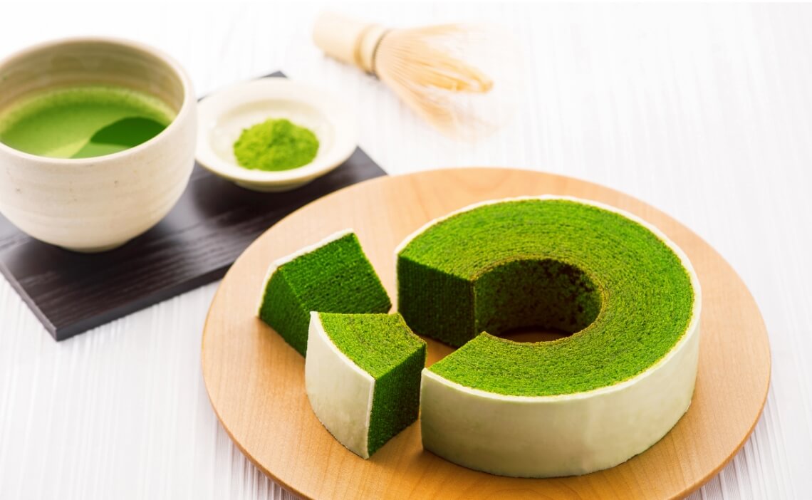 静岡県産抹茶と清水養鶏場の美黄卵など静岡素材にこだわり、職人が一層一層焼き上げました。クラシカルなずっしりと固めの生地は抹茶の風味豊か。周りのフォンダン(糖衣)は、抹茶の緑とのコントラストも鮮やかです。
