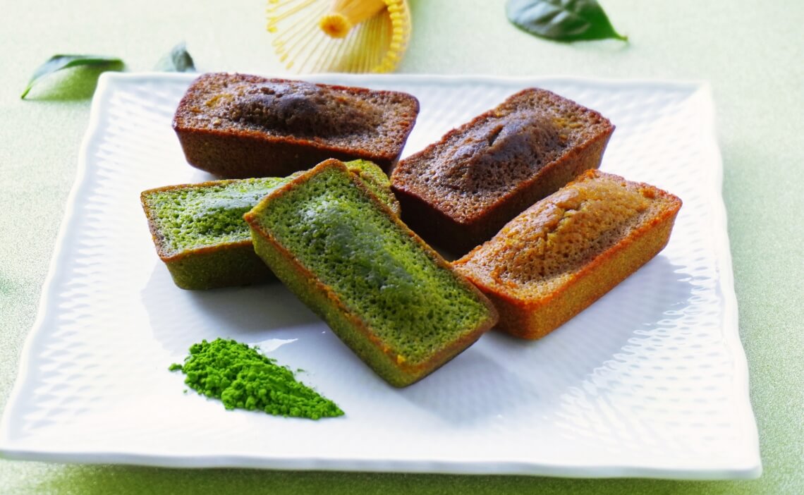 芳醇なバターと茶の風味広がる、しっとり食感のフィナンシェ。「抹茶」は、ほのかな苦みとさわやかな香り広がる静岡県産抹茶を使用。